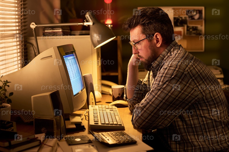 Белый мужчина работает до поздней ночи за столом с винтажным компьютером