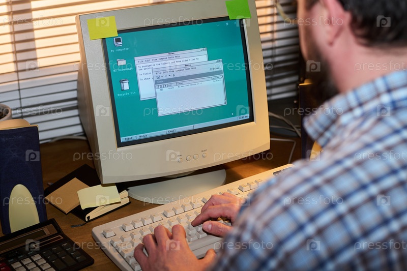 Кавказский молодой взрослый мужчина использует старый настольный компьютер в офисной обстановке