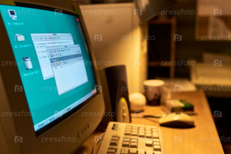 Монитор компьютера, отображающий старую операционную систему в старой конфигурации офиса