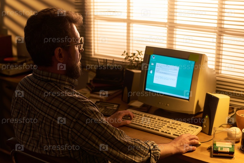 Кавказский мужчина печатает на старом компьютере в течение часов захода солнца