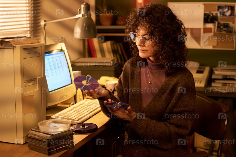 Кавказская женщина организует компакт-диски в винтажной офисной обстановке
