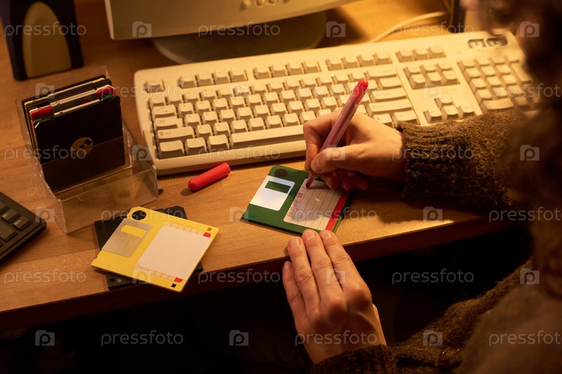 Женщина, маркирующая диски рядом с компьютерной клавиатурой