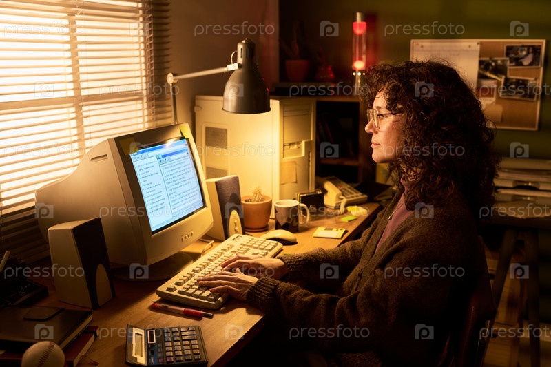 Кавказская женщина работает на настольном компьютере в домашней офисной обстановке