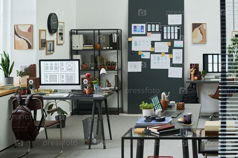 Творческое рабочее пространство офиса с использованием цифровых устройств и современного планирования дизайна