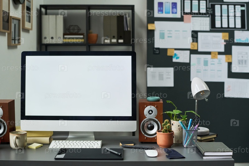 Рабочее пространство с настольным компьютером и креативным дизайном Планирование современного дизайна