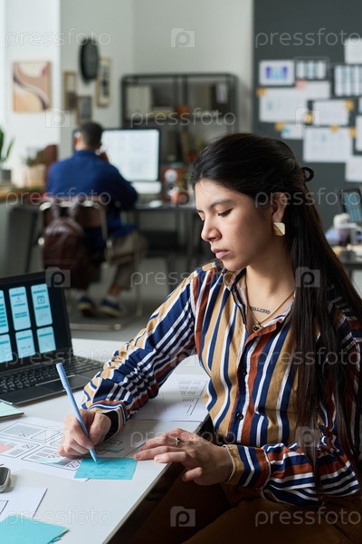 Молодая взрослая испаноязычная женщина разрабатывает пользовательский интерфейс Wireframes в современном офисе