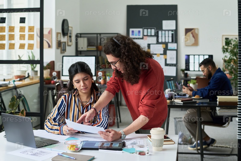 Молодой белый мужчина объясняет документы молодой испаноязычной женщине в офисе