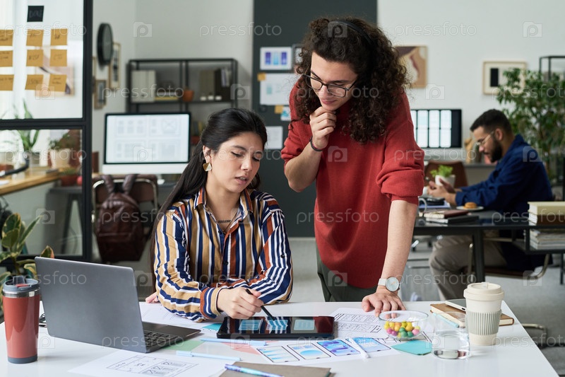 Молодой взрослый кавказский мужчина направляет молодую взрослую латиноамериканскую женщину с помощью цифрового планшета