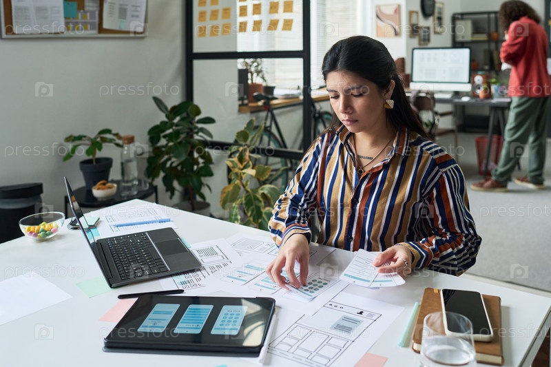 Молодая взрослая кавказская женщина разрабатывает интерфейс мобильного приложения на рабочем столе
