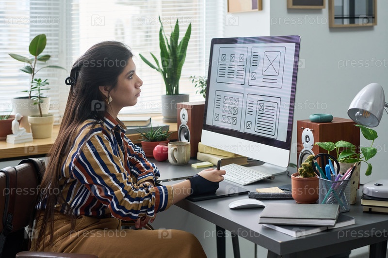 Молодая испаноязычная женщина разрабатывает интерфейс веб-сайта на настольном компьютере