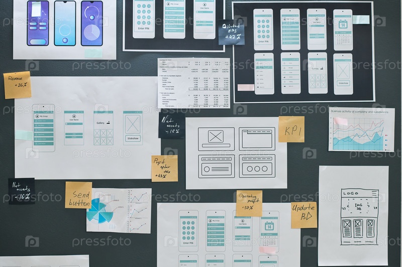 Wireframes приложений и мобильные диаграммы данных отображаются на стене офиса во время планирования