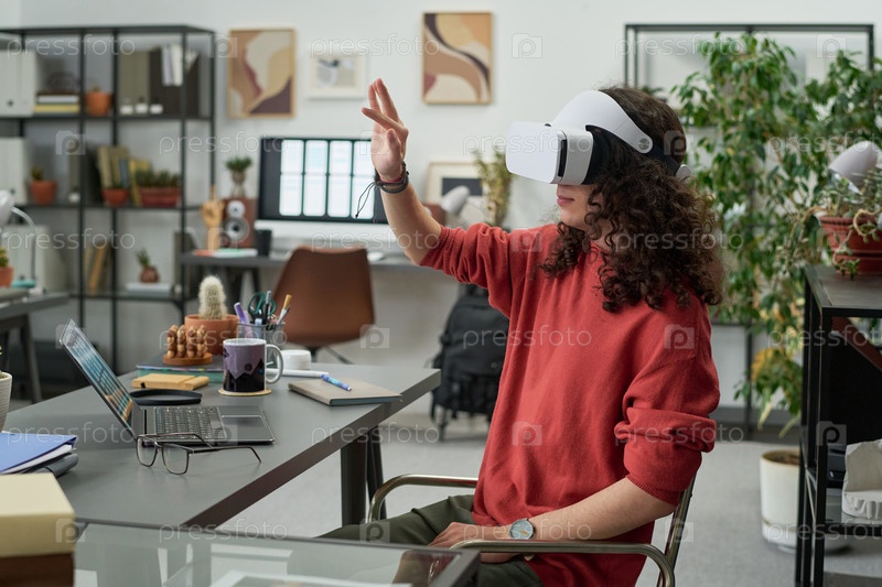 Молодой взрослый белый мужчина использует гарнитуру виртуальной реальности во время жестов