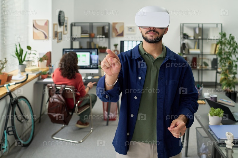 Молодой взрослый мужчина использует гарнитуру виртуальной реальности в современном офисе