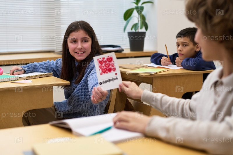 Кавказская девочка-подросток делится ручной карточкой со своим одноклассником в классе