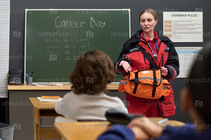 Кавказская женщина среднего возраста Парамедик объясняет экстренное оборудование детям