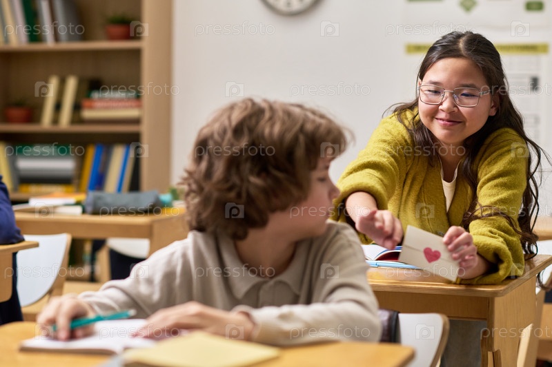Подростковая белая девушка передает записку с сердцем подростковому белому мальчику