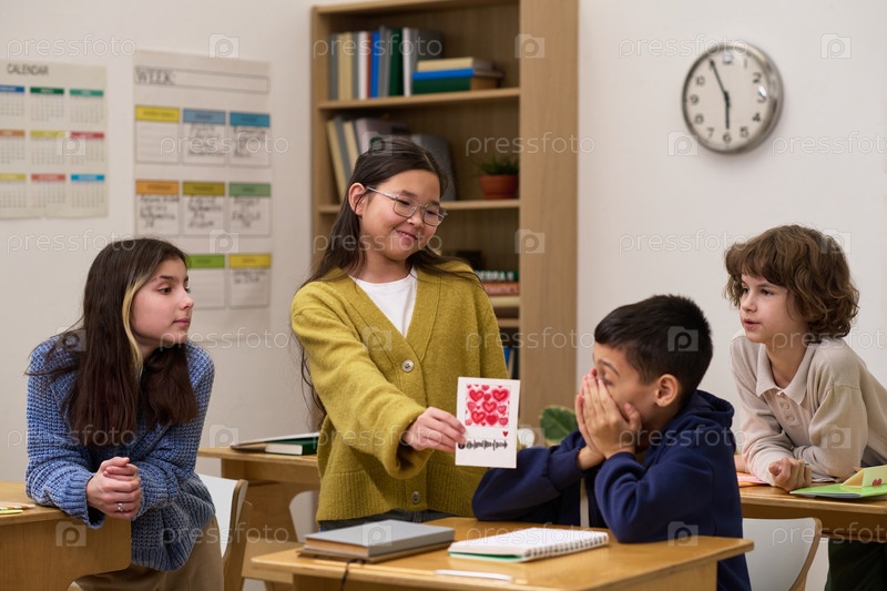 Мультиэтническая группа детей, представляющих ручной карточку во время занятий в классе