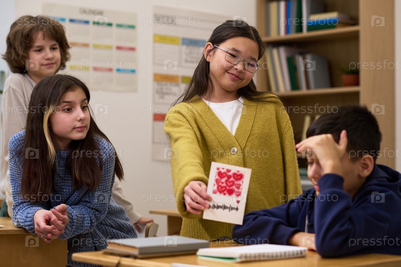 Десятнадцатилетние многонациональные девочки показывают ручной карточку мальчику в классе
