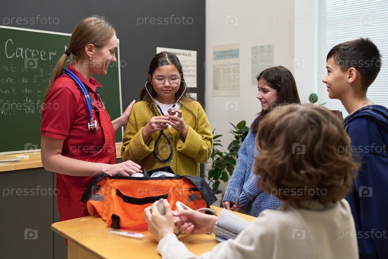 Кавказская женщина-парамедик преподает разным подросткам, используя медицинское оборудование