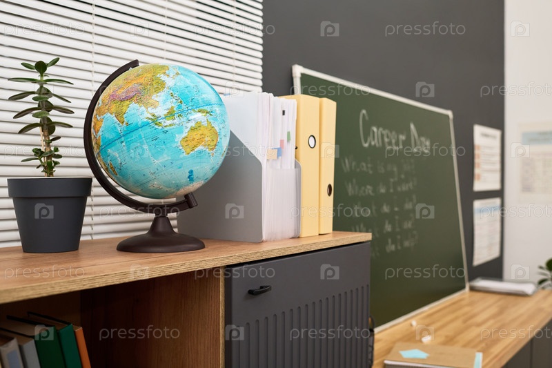 Глобус и офисные принадлежности расположены на полке в современной обстановке класса