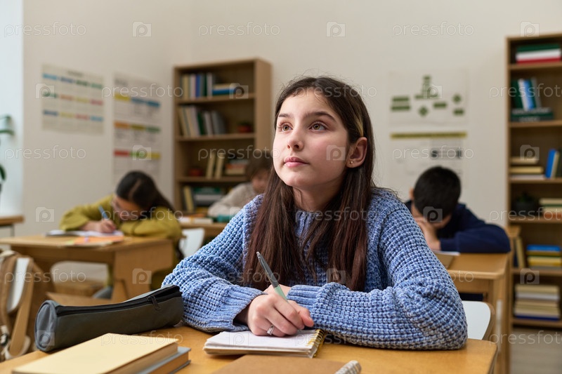 Кавказская девочка-подросток, сидящая за столом и размышляющая во время урока в классе