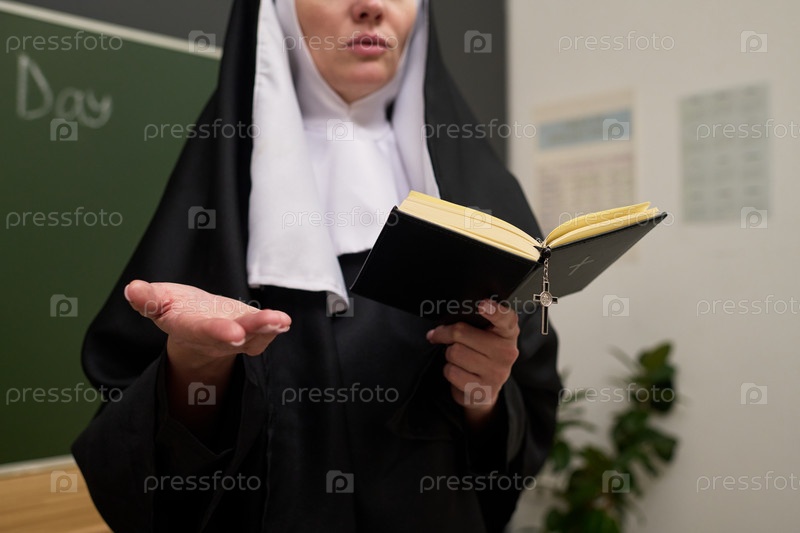 Кавказская монахиня среднего возраста читает книгу и жестикулирует во время урока в классе