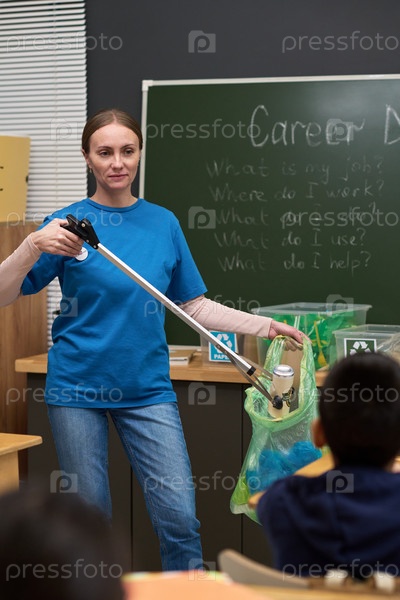 Кавказская женщина среднего возраста учит детей переработке в классе