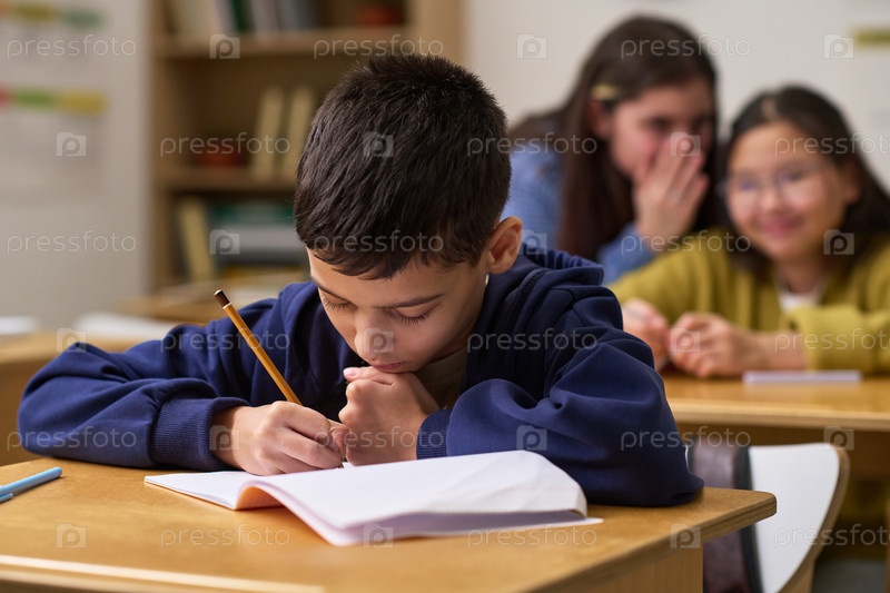 Мальчик сосредотачивается на написании, пока девочки-подростки шепчутся в классе