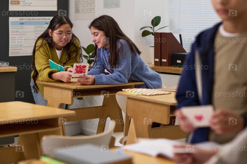 Девочки-подростки, сотрудничающие в классном проекте с помощью флешкарт в школе