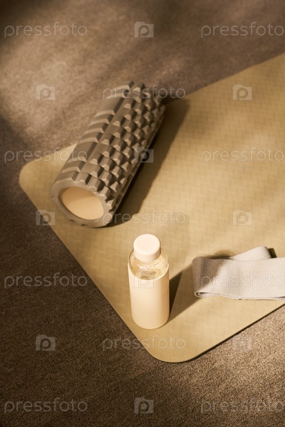 Пеновой ролик, бутылка с водой и резистентная группа отдыхают на йога-матке