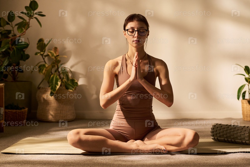 Молодая взрослая белая женщина медитирует в положении лотоса практикует осознанность