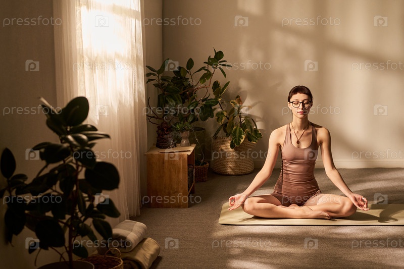 Молодая взрослая белая женщина практикует сидячую медитацию в солнечной комнате