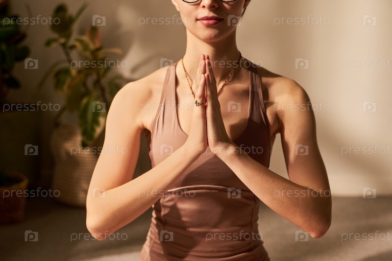 Молодая взрослая белая женщина практикует медитацию йоги в помещении с закрытыми глазами