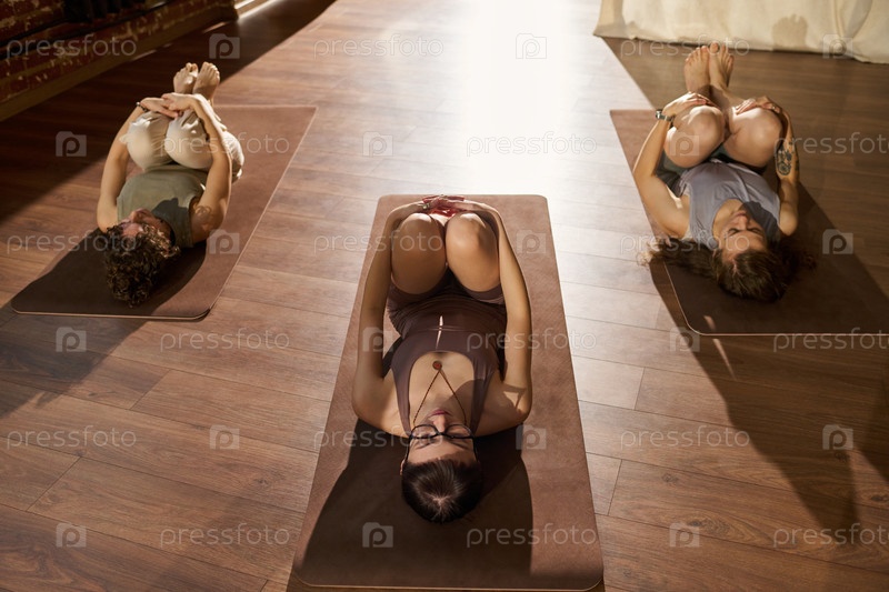 Молодые взрослые, практикующие позы йоги на ковриках в студийной обстановке
