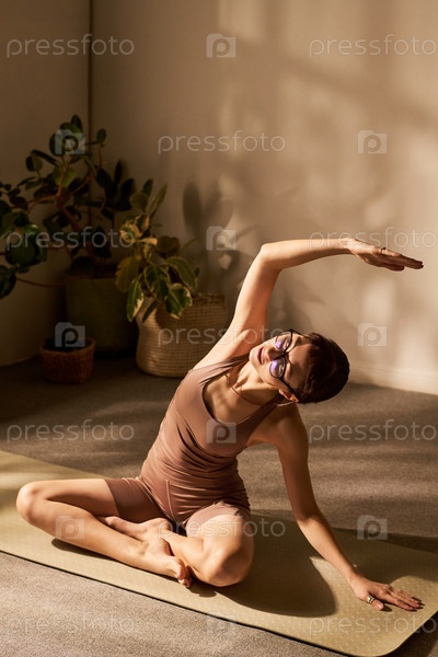 Молодая взрослая белая женщина практикует сидячую йогу и растяжку в помещении