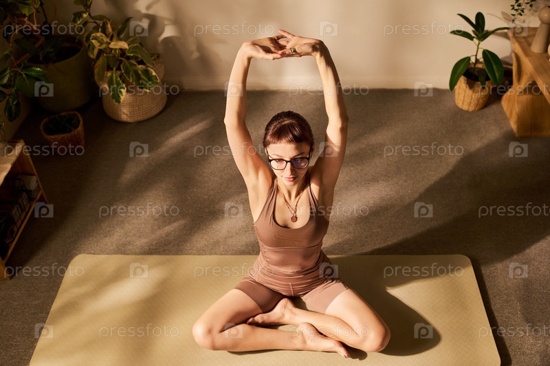 Молодая взрослая кавказская женщина практикует йогу, растягиваясь на тренажерном коврике в помещении