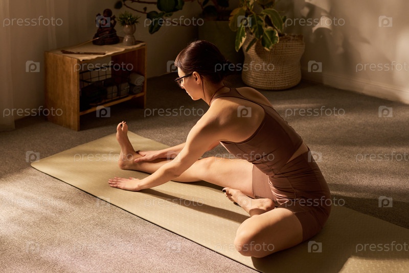 Молодая взрослая белая женщина растягивается на йога-матке во время утренних упражнений