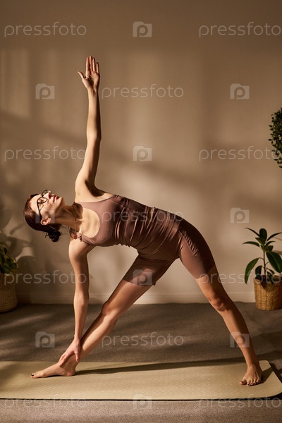 Кавказская молодая взрослая женщина выполняет треугольную позу во время домашней сессии йоги