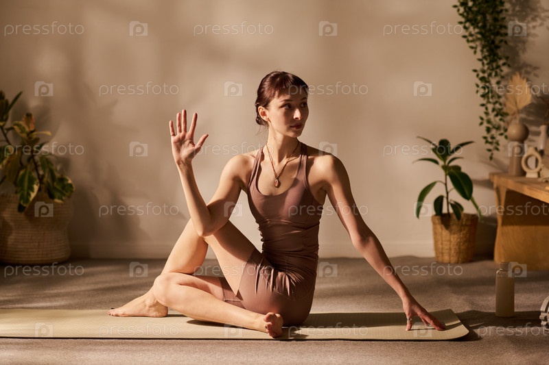 Молодая взрослая белая женщина практикует сидячую йогу Twist на тренажерной коврике