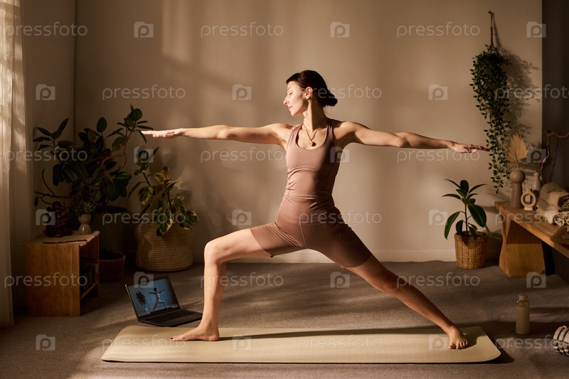 Молодая взрослая белая женщина практикует йогу, позирует перед ноутбуком в помещении