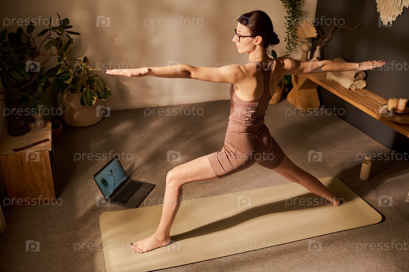 Кавказская молодая взрослая женщина балансирует в позе воина во время сеанса виртуальной йоги
