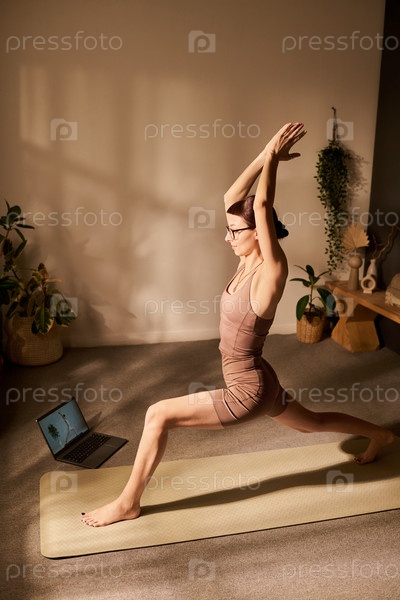 Молодая взрослая белая женщина практикует йогу, позирует в помещении с помощью ноутбука