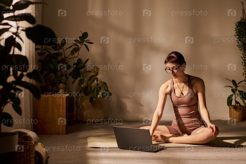 Кавказская молодая взрослая женщина, сидящая с перекрещенными ногами и участвующая в виртуальной сессии йоги