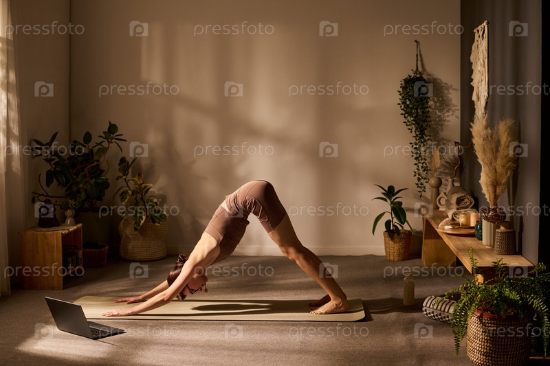 Молодая взрослая белая женщина практикует йогу, позируя на мате во время онлайн-класса