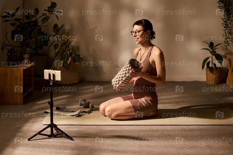 Молодая взрослая кавказская женщина снимает онлайн-уроки фитнеса с использованием пенового ролика