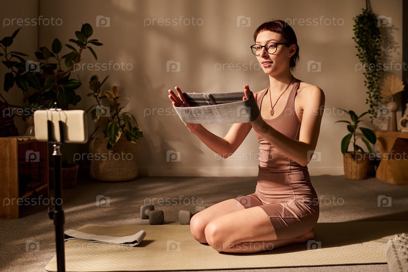 Молодая взрослая кавказская женщина записывает онлайн-уроки фитнеса с использованием резистентной группы