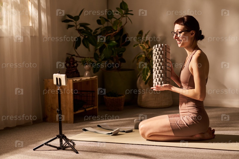 Молодая кавказская женщина записывает учебник по фитнесу с использованием пенового ролика в помещении