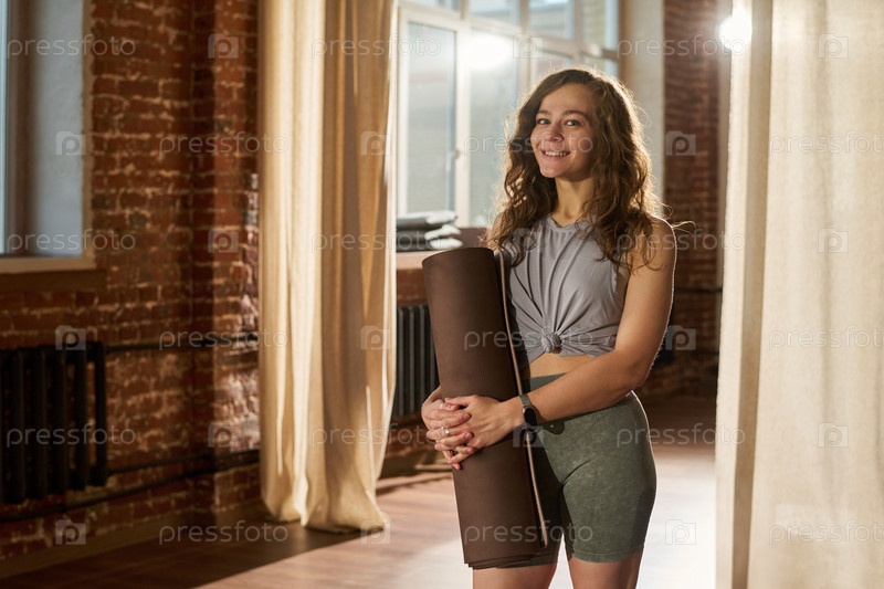 Портрет молодой взрослой белокожей женщины, улыбающейся в то время как она держит йога-матку внутри