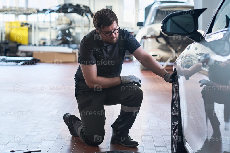 Кавказский молодой взрослый мужчина проверяет колесо автомобиля в авторемонтной мастерской