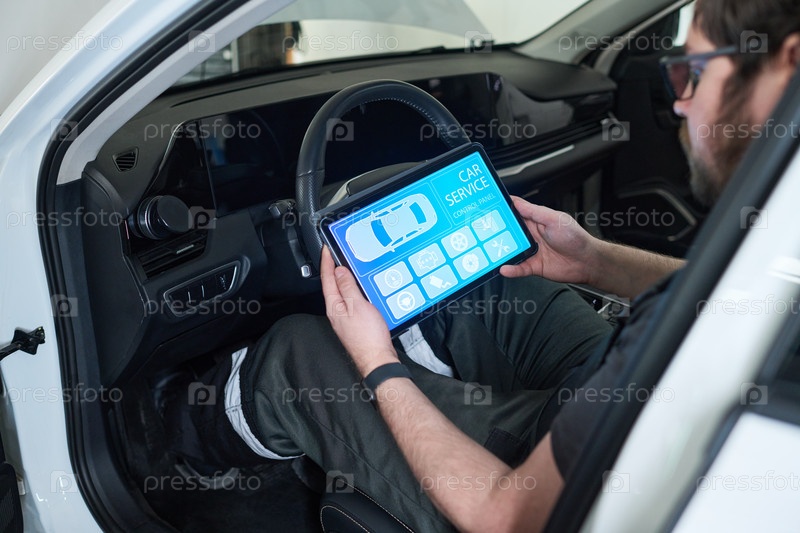 Молодой взрослый кавказский мужчина проводит диагностику транспортного средства с помощью цифрового планшета